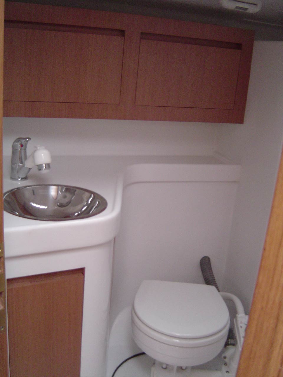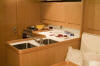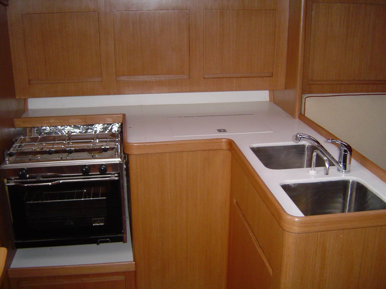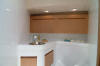 armário na parte inferior em fiberglass e armários na parte superior em mogno